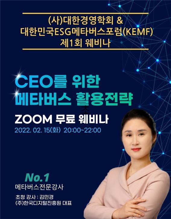 대한민국ESG메타버스포럼은 (주)한국디지털진흥원 김민경 대표를 초청해서 각 기관과 기업을 대표하는 CEO를 대상으로 메타버스 활용전략에 대해 '제1회 웨비나'를 무료로 진행할 예정이다. 김민경 대표는 메타버스에 대한 기업체 특강, 공무원 연수 등 다양한 교육과 컨설팅 경험을 갖고 있고, 온오프라인 영상촬영장비와 시설도 갖추고 있는 업체를 운영하고 있다.