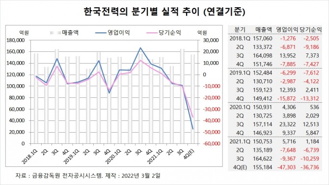 한국전력의 적자는 지난해 2분기부터 계속됐는데 4분기 들어 적자폭이 더욱 커졌습니다. 지난해 4분기에는 매출액 15조5184억원, 영업이익 –4조7303억원, 당기순이익 –3조6736억원을 기록했습니다.
