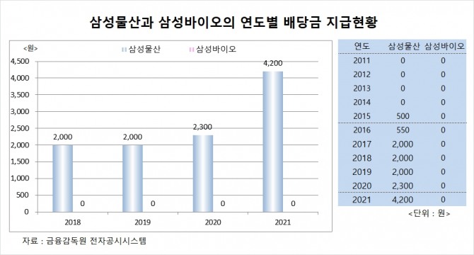 삼성물산 2021년 회계년도에 주당 4200원 배당금 vs 삼성바이오 2011년 설립후 한번도 배당금 없어…증권가에서는 삼성물산의 삼성바이오 매각 가능성도 배제안해