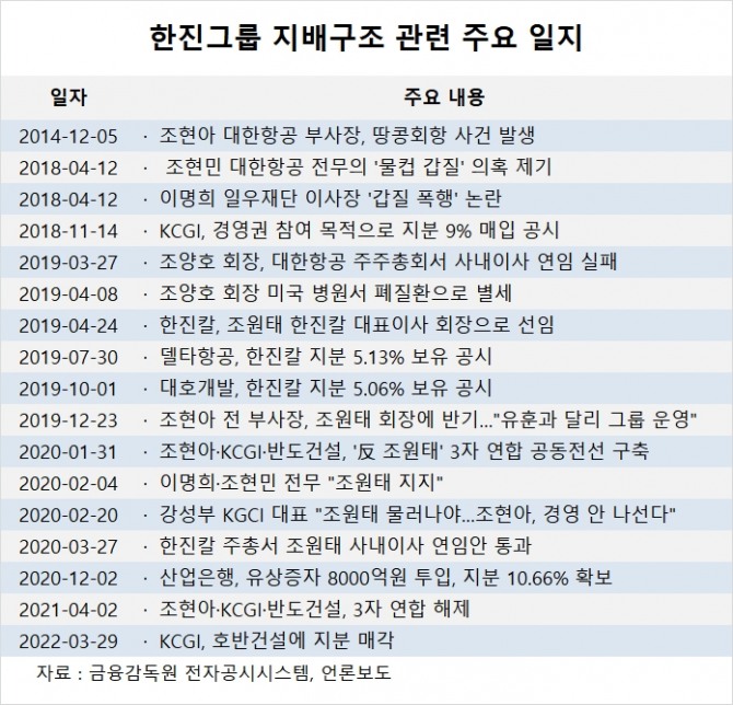 KCGI는 그해 11월 14일 경영권 참여 목적으로 한진칼 지분 9%를 매입했다고 공시하면서 조원태 회장과의 경영권 분쟁이 가시화됐습니다.
