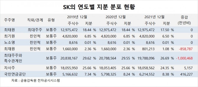 최태원 회장은 지난해 말 현재 SK의 보통주 지분 17.50%(1297만5472주)를 보유하고 있습니다. 서울가정법원으로부터 처분을 금지받은 주식 350만주는 최 회장 보유 주식의 26.97%에 달합니다.