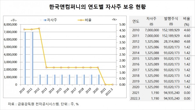한국앤컴퍼니는 지난 2021년 4월 한국아트라스BX를 소규모 흡수합병하면서 합병의 대가로 자사주를 132만3900주를 처분했습니다.