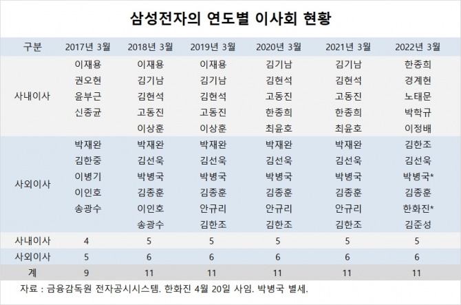 삼성전자 사외이사로는 김한조 전 하나금융나눔재단 이사장, 김선욱 이화여대 명예교수, 김종훈 Kiswe Mobile 회장, 김준성 전 싱가포르투자청 토탈리턴그룹 이사가 이름을 올렸습니다. 한화진 사외이사는 지난 3월 신규 선임됐으나 윤석열 정부의 초대 환경부 장관으로 지명되면서 지난 4월 20일 사임했고 박병국 사외이사는 지난 5월 17일 별세했습니다.