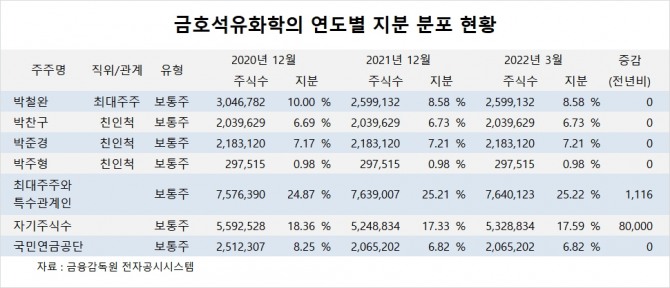 금호석유화학의 지배구조는 박철완 전 상무가 올해 3월 말 기준 지분 8.58%를 갖고 있는 최대주주이지만 박 전 상무는 경영일선에서 퇴출당한 상태입니다.