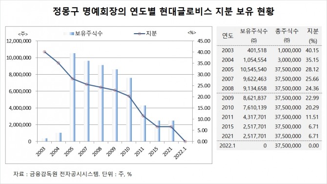 2003년 지분 40.15%서 올해 1월 0%로, 정 명예회장 주식 취득 평균 단가 주당 500원