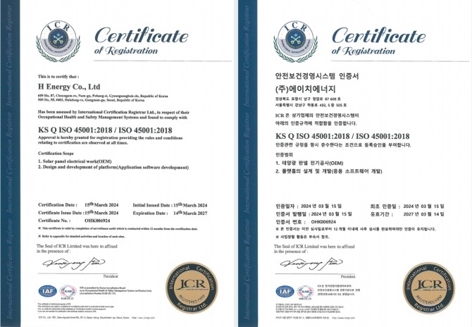 에이치에너지는 최근 국제표준화기구(ISO)의 공인을 받은 안전보건관리 경영시스템 ‘ISO 45001’ 인증을 획득했다고 1일 밝혔다.