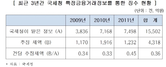 2009년부터 2011년까지 3년간 이 정보를 활용해 국세청이 추징한 금액은 4318억원 수준으로 금융정보분석원의 특정금융거래정보가 조세범칙사건에 유용하게 활용되고 있는 것으로 분석됐다.