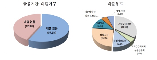 한국은행이 지난해 12월 3일부터 28일까지 전국 2119가구를 대상으로 '2012년 가계금융·복지조사(부가조사)' 한 결과에 따르면 지난해 금융기관으로부터 대출받은 가구는 전체의 57.1%였다.