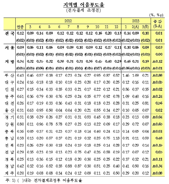 지역별로는 서울(0.09%)이 0.03%p 상승하고 지방(0.19%)은 0.12%p 하락했다.