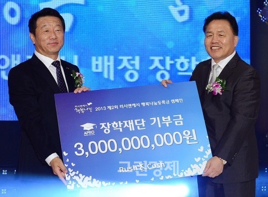 아프로파이낸셜그룹(러시앤캐시)이 출연한 재단법인 아프로에프지장학회는 22일 ‘2013 제2회 러시앤캐시 행복나눔 등록금 캠페인’ 장학증서 수여식을 열고, 총 600명의 대학생에게 2학기 등록금 전액장학금을 지급한다.