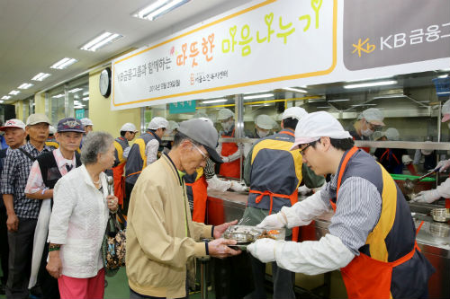기념식 이후 KB금융그룹은 종로구 경운동 서울노인복지센터 및 일대 5개 복지관을 방문 무료 급식을 나누는 이른바 ‘KB금융그룹과 함께하는 따뜻한 마음 나누기’ 봉사활동을 진행 했다. 이날 봉사활동에는 그룹의 새로운 출발을 다짐하며 KB금융그룹 직원 봉사자 90여명과 지주사 임직원이 참여했다. KB금융그룹은 “기업의 사회적 책임에 충실한 사회공헌 활동을 지속적으로 전개 하겠다”고 밝혔다. KB금융은 “주전산기사태”로 떨어진 직원 사기 진작과 새로운 출발을 다짐하는 분위기 속에서 이날 행사를 마쳤다.