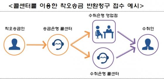 잘못 송금한 돈을 되찾으려면 은행 영업점 방문 없이 콜센터 착오송금 반환청구 접수를 하면된다. 영업점 방문이 어렵거나 영업시간이 아니어도 반환 청구를 할 수 있게 하기 위해서다. 반환 신청을 받은 송금은행 콜센터는 수취은행 영업점이나 콜센터에 착오송금 반환업무 처리를 의뢰한다.