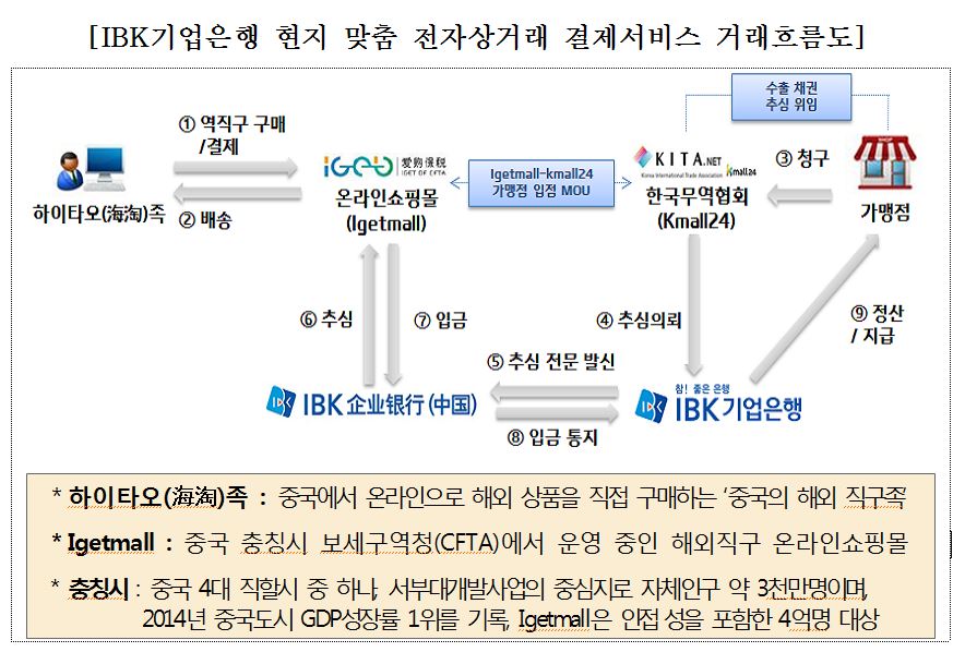 올해 초 한국무역협회는 중국 충칭 량장신구 관리위원회와 협약을 통해 충칭시 보세구역청에서 운영하는 쇼핑몰 Igetmall에서 Kmall24에 등록된 물품을 판매하기로 했다. 그러나 이 사업은 한국 기업이 중국 구매자의 물품 구입 대금을 정산받는 해외결제 부분이 해결되지 않아 진행이 지연되고 있었다.