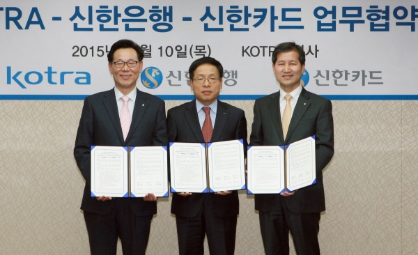 [글로벌이코노믹 유은영 기자] 신한은행은 대한무역투자진흥공사(이하 KOTRA)와 신한은행 기업그룹 최병화 부행장, KOTRA 중소기업지원본부 윤효춘 본부장과 신한카드 영업부문 이재정 부사장이 참석한 가운데 국내 중소기업의 해외진출 지원 및 외국인 투자가의 국내 비즈니스 지원을 위한 업무협약을 체결했다고 10일 밝혔다.