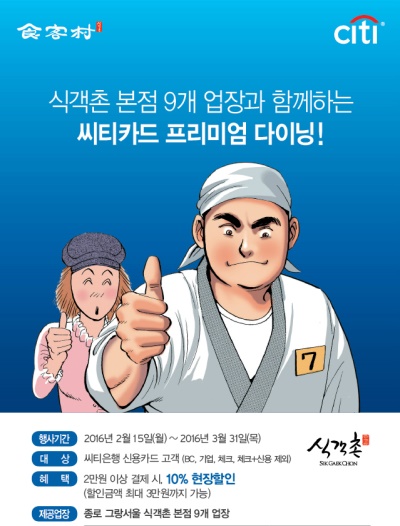 한국씨티은행(은행장 박진회)은 오는 3월 31일까지 씨티카드 고객을 대상으로 식객촌 본점 9개 업장에서 할인 혜택을 제공한다고 밝혔다.