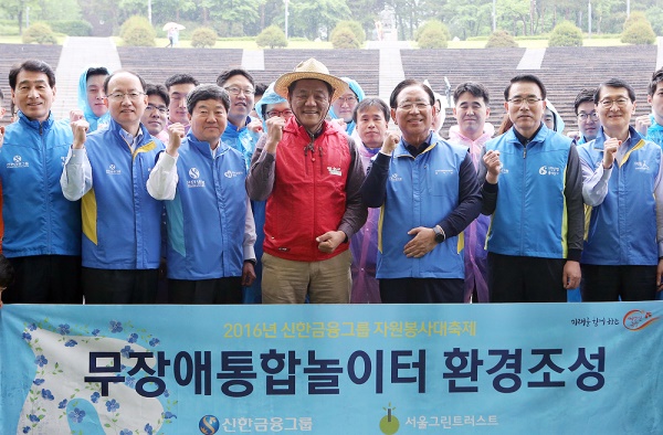 이미지 확대보기신한금융그룹은 지난 10일 한동우 회장을 비롯한 그룹사 CEO들이 광진구 능동에 위치한 어린이대공원에서 장애가 있는 어린이들과 비장애 어린이들이 함께 어울릴 수 있는 ‘무장애 통합놀이터 녹지조성’ 봉사활동을 실시했다고 밝혔다.