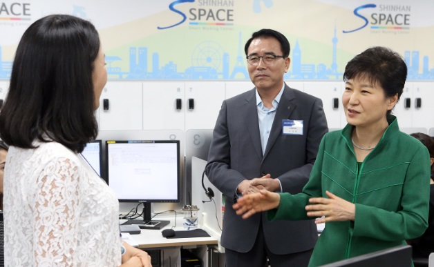 이미지 확대보기신한은행에 따르면 이날 유연근무제 현장을 직접 방문한 박근혜 대통령은 조용병 신한은행장으로부터 유연근무제 운영노하우에 대한 설명을 듣고 실제로 스마트워킹센터에서 일하는 직원들과 이야기를 나눴다.