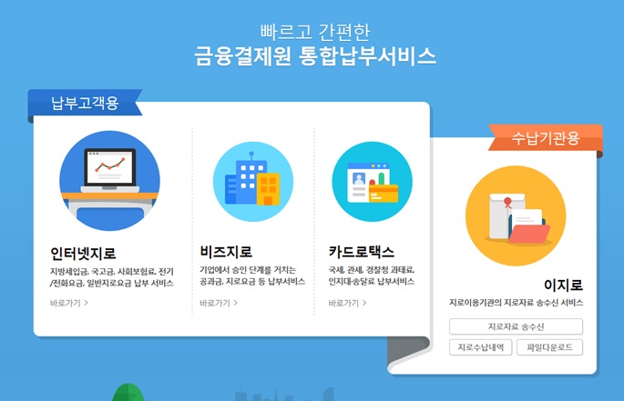 사업자가 송부한 지로 고지서, 공과금, 정부 및 지방자치단체의 각종 세금·세입금·범칙금 등을 금융회사 창구에 가지 않고 인터넷이나, 휴대폰을 통해 납부하면 된다.