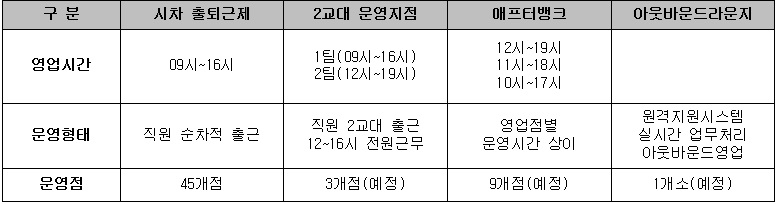 이미지 확대보기이번에 시범 운영되는 유연근무제는 ▲시차 출퇴근제 ▲2교대 운영지점 ▲애프터뱅크(AfterBank) ▲아웃바운드라운지(가칭) 등 총 4개 모델이다.