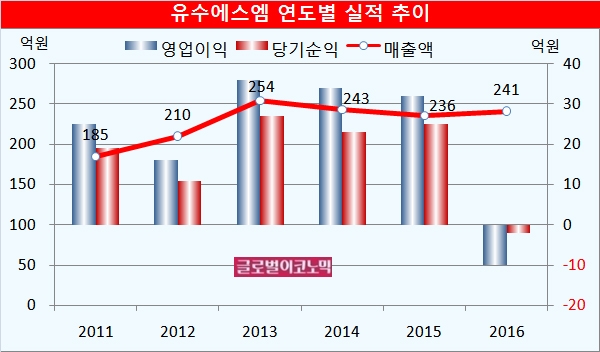 유수에스엠은 지난해 매출액이 241억원으로 2015년의 236억원보다 많았지만 영업이익 -10억원, 당기순이익 -2억원을 기록했다.