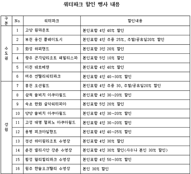 신한카드는 전국 28개 제휴 워터파크에서 최대 40% 현장할인 혜택을 제공하고 8월 1일부터 8월 31일까지 오션월드 입장권 구매 시 1장당 1장을 추가로 증정한다.