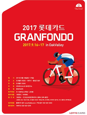 '2017 롯데카드 그란폰도 in 오크밸리'는 8월 11일 오전 9시부터 더바이크 홈페이지를 통해 참가 접수가 가능하다. 참가비는 1인당 8만원이며 롯데카드 결제 시 30% 할인 받을 수 있다. 세부내용은 롯데카드 홈페이지 또는 오크밸리 홈페이지에서 확인 가능하다.