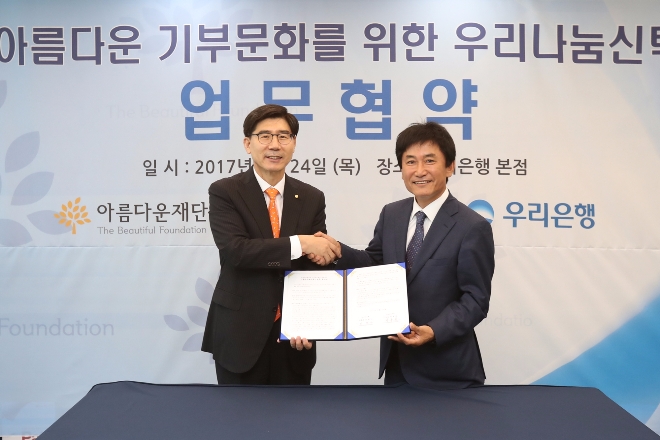 이날 협약은 서울 중구 본점에서 기부문화 확산을 위해 양 기관의 상호협력을 목적으로 이뤄졌다. 협약에 따라 우리은행과 아름다운재단은 '우리나눔신탁'을 통해 기부 희망자를 상호 소개하기로 했다.