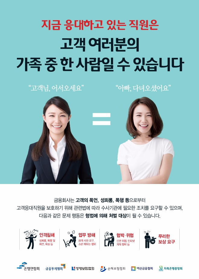 은행연합회를 포함한 6개 금융업권별 협회는 30일 고객응대직원의 인권 보호를 위해 '고객응대직원 보호 포스터'를 제작했다고 밝혔다.