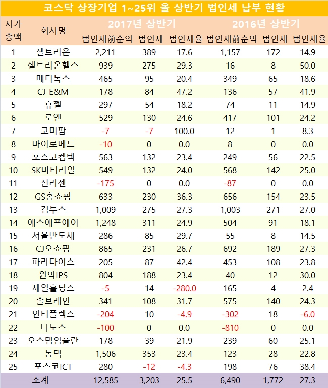 특히 코스닥 상위 1~25위 업체들의 법인세 납부 실적이 두드러졌다.