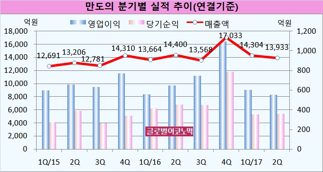 만도는 지난해 꾸준한 실적 상승세를 기록했으나 올해 들어서는 실적이 내리막길을 걷고 있다.