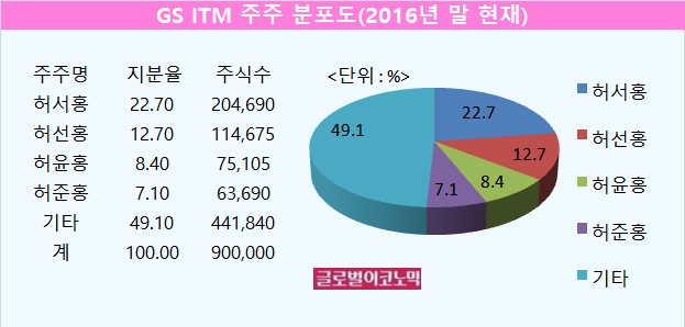 또 GS ITM의 기타 주주는 49.1%(44만1840주)로 나타났는데 사실상 허씨 오너가의 인물들이 지분 100%를 보유한 것으로 알려졌다.