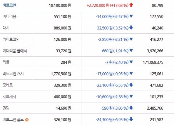 이미지 확대보기지난 6일 1600만원을 돌파하며 1400만원대에서 신기록을 세웠던 비트코인이 하루 만에 기록을 경신했다. 비트코인 외에 나머지 가상화폐는 모두 하락했다.