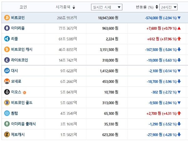 이미지 확대보기정부의 가상화폐 규제 방침으로 비트코인 등 대부분의 가상화폐 시세가 위축된 모양새다.