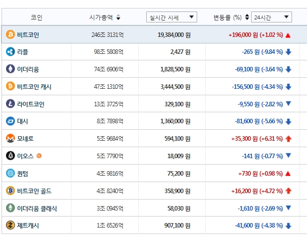 이미지 확대보기국내 최대 가상화폐 거래소 빗썸거래소에 따르면 1비트코인당 시세는 16일 오전 7시32분 현재 1938만4000원으로 전일대비 19만6000원 상승했다.