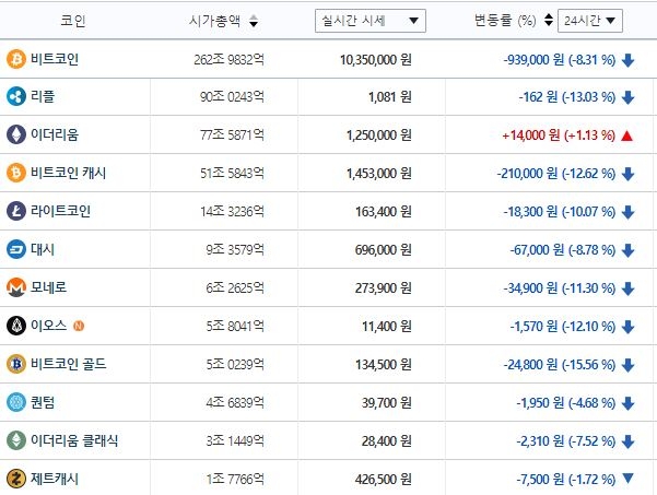 이더리움이 1.13%로 소폭 상승한 걸 제외하곤 대부분 가상화폐의 시세가 큰 폭으로 하락했다. 비트코인 골드가 15.56%로 가장 큰 폭으로 하락한 가운데 모네로 11.30%↓, 이오스 12.10%↓ 등의 수치를 나타냈다.