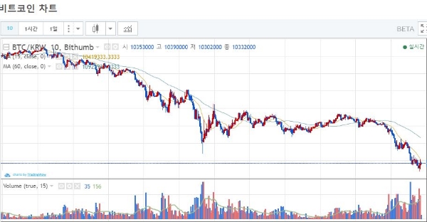 1일 오후 11시 15분 가상화폐 거래소 빗썸에서는 비트코인이 전일 대비 8.31% 하락한1035만원에 거래됐다. 비트코인 시세는 지난 30일 1280만원대에서 100만원 자리 숫자를 바꾸며 빠른 속도로 하락하고 있다.
