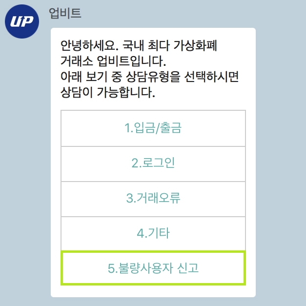 업비트에서 진행되는 신고는 카카오에 개설되어 있는 ‘업비트 상담톡’에서 가능하다. 카카오에서 업비트 검색 또는 업비트 앱에서 톡으로 상담하기를 클릭 후 말을 걸고 5번 ‘불량사용자 신고’ 버튼을 누르면 간단히 접수할 수 있다.