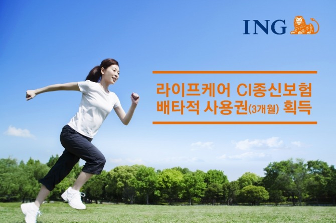 ING생명은 ‘국민체력100’ 사업과 연계한 건강증진형 보험상품인 ‘무배당 라이프케어 CI종신보험’이 생명보험협회 신상품심의위원회로부터 3개월간의 배타적 사용권을 획득했다고 17일 밝혔다.