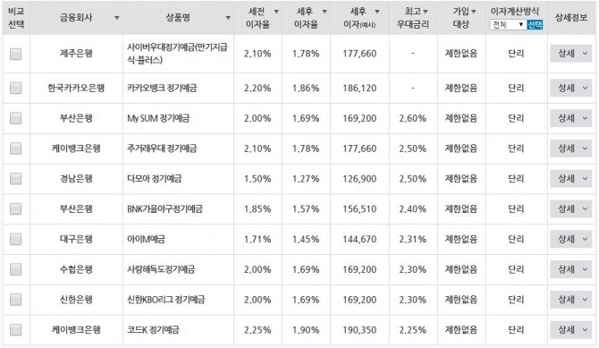 부산은행의 BNK가을야구정기예금이 2.4%, 대구은행의 아이M예금이 2.31%순으로 나타났고 수협은행의 사랑해독도정기예금과 신한은행의 신한KBO리그 정기예금이 최고 연 2.3%로 동일했다.