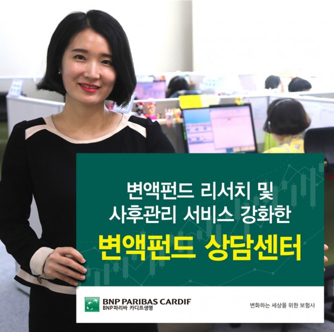 BNP파리바 카디프생명은 변액펀드 상담센터 서비스 제공에 앞서 최고투자책임자 산하에 ‘변액펀드 리서치&서비스팀’을 신설하고, 펀드주치의를 포함한 변액펀드 전문 인력을 배치하는 등 관련 조직 정비를 마쳤다.