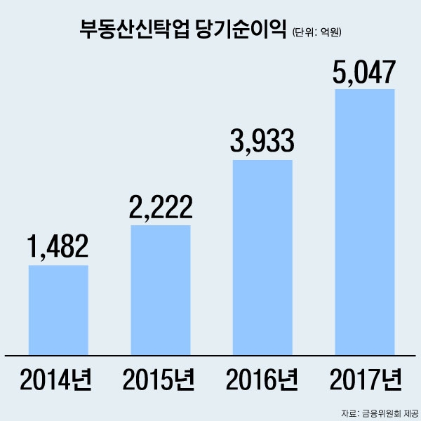 이미지 확대보기최근 금융위원회가 발표한 ‘부동산신탁업 경쟁도 평가 보고서’에 따르면 현재 시장에 진출해있는 11개 부동산신탁사의 총 자산규모는 약 4조원에 달한다. 이들의 지난해 영업이익과 순이익도 각각 6705억원과 5047억원을 기록하면서 최근 5년 동안 연평균 35%씩 증가한 것으로 나타났다.