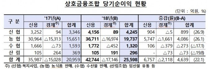 농협·신협·수협·산림조합 등 상호금융조합의 지난해 신용사업 부문 순이익은 4조2744억 원으로 18.8% 증가했다.