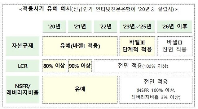 금융위는 26~27일로 예정된 인터넷전문은행 신규 예비인가 신청은 현행 규정에 따라 진행하되 바젤Ⅲ 관련 개정 규정에 따른 건전성 관리계획을 추가로 제출받아 심사·평가하기로 했다.