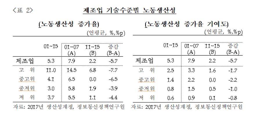 보고서에 따르면 2011~2015년 전산업의 노동생산성 증가율이 평균 2.1% 포인트 낮아진 가운데 제조업 생산성 증가율은 5.7% 포인트가 하락한 것으로 나타났다.