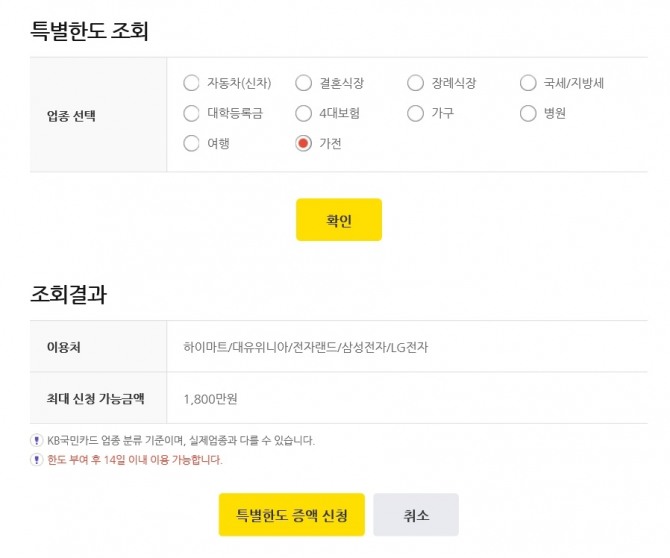 예를 들어, KB국민카드의 경우 여행업종의 특별한도를 신청하면 항공사와 관광여행사업종에서 결제가 가능하다고 확인되지만, 가전을 신청하면 하이마트, 대유위니아, 전자랜드, 삼성전자, LG전자에서만 특별한도를 적용받는다.