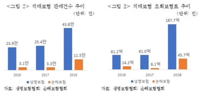 또 치매는 80세 이상의 연령층에서 발병률이 급증하는 질환으로 20~30년 후 주요 가입 연령층(40~60세)의 보험금 청구가 증가할 경우 약관 모호 및 불완전판매 등으로 치매보험금 지급 관련 민원 및 분쟁 유발 가능성이 크다.