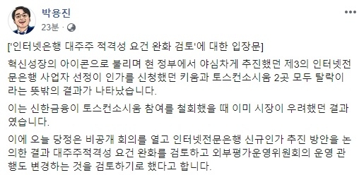 이미지 확대보기30일 박용진 더불어민주당 의원은 SNS 입장문을 통해 “혁신성장의 아이콘으로 불리며 현정부에서 야심차게 추진했던 제3인터넷전문은행 사업자 선정에서키움과 토스컨소시움 2곳 모두 탈락이라는 뜻밖의 결과가 나타났다”며 “신한금융이 토스컨소시움 참여를 철회했을 때 이미 시장이 우려했던 결과”라고 밝혔다. 이어 “오늘 당정은 비공개 회의를 열고 인터넷전문은행 신규인가 추진 방안을 논의한 결과 대주주적격성 요건 완화를 검토하고 외부평가운영위원회의 운영 관행도 변경하는 것을 검토하기로 했다”고 말했다.