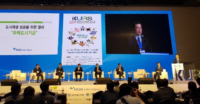 이미지 확대보기이 사장은 17일 서울 용산구 드래곤시티 호텔에서 한국토지주택공사(LH) 등과 공동 주최한 '2019 대한민국 도시재생 심포지엄'에 참석해 "원활한 도시재생사업 추진을 위해서는 사업자의 수요에 맞는 자금 조달이 적기에 지원되어야 한다"며 HUG의 도시재생 활성화 역할과 책임을 밝혔다.