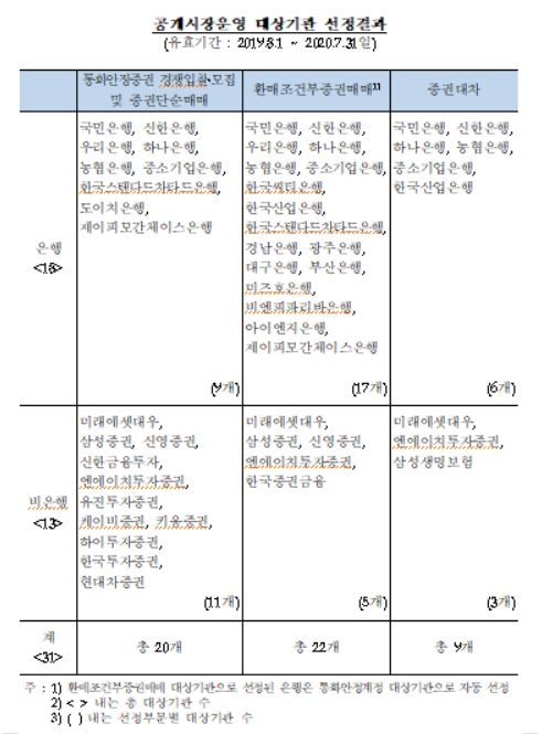 공개시장운영은 중앙은행이 금융기관을 대상으로 증권 등을 사고팔아 유동성과 금리에 영향을 주는 정책 수단이다 .한은은 현행 공개시장운영 대상기관의 유효기간이 오는 31일 끝나면서 다음달 1일부터 2020년 7월31일까지 공개시장운영에 참여할 수 있는 기관을 새로 선정했다. 통화안정증권 인수·유통 실적, 환매조건부증권 매매 실적과 정책 호응도 등을 종합적으로 고려했다는 설명이다.