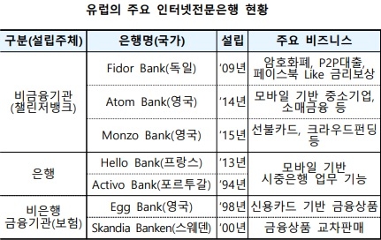 유럽 지역의 인터넷전문은행은 대형은행이나 금융그룹의 계열사 또는 사업부의 형태로 운영되는 경우가 많다. 최근에는 IT 기반의 챌린저뱅크(Challenger Bank)의 형태가 주목받고 있다. 챌린저뱅크는 소셜네트워크서비스(SNS)를 기반으로 고객참여를 유도하고 암호화폐, P2P(개인간)대출 등 금융서비스를 제공한다. 또 모바일 송금과 선불카드 서비스, 자산관리 서비스 등 틈새시장을 창출하고 있다.